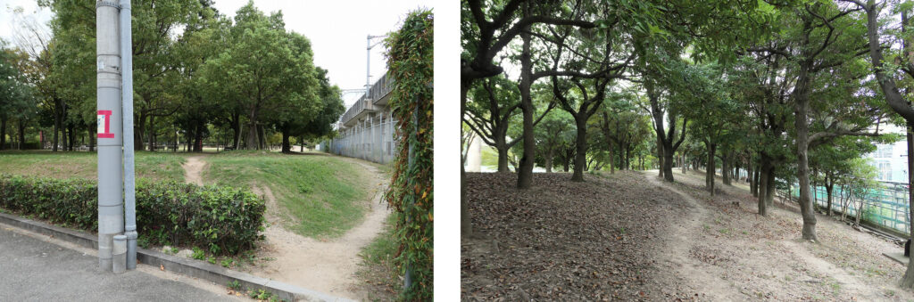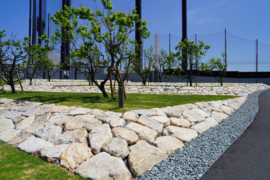 ボウル広場と外周園路の間は、既存樹を移植する棚田のような『ひな壇造成』を提案した。敷地内には、阪神・淡路大震災時に集積されたと思われる自然石が大量に残っていたため、処分するに困るのであれば土留めの素材として活用すれば良いと考えたためだ。このような立体的な修景を行った結果、搬出処分しなければならなかった土工事量は千立米単位で縮減でき、自然石の処分量も減らすことができた。また、処分予定であった巨石の活用して、休憩地や遊び場にもなるストーンサークルを設けた。